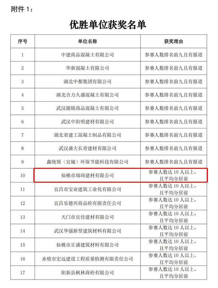 喜訊|瑞琦建材榮獲湖北省預拌混凝土(砂漿)企業質量管理知識競賽“優勝單位”